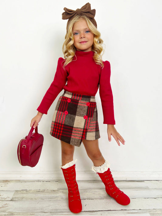 Turtleneck Knit Sweater & Checkered Skort Set: Re