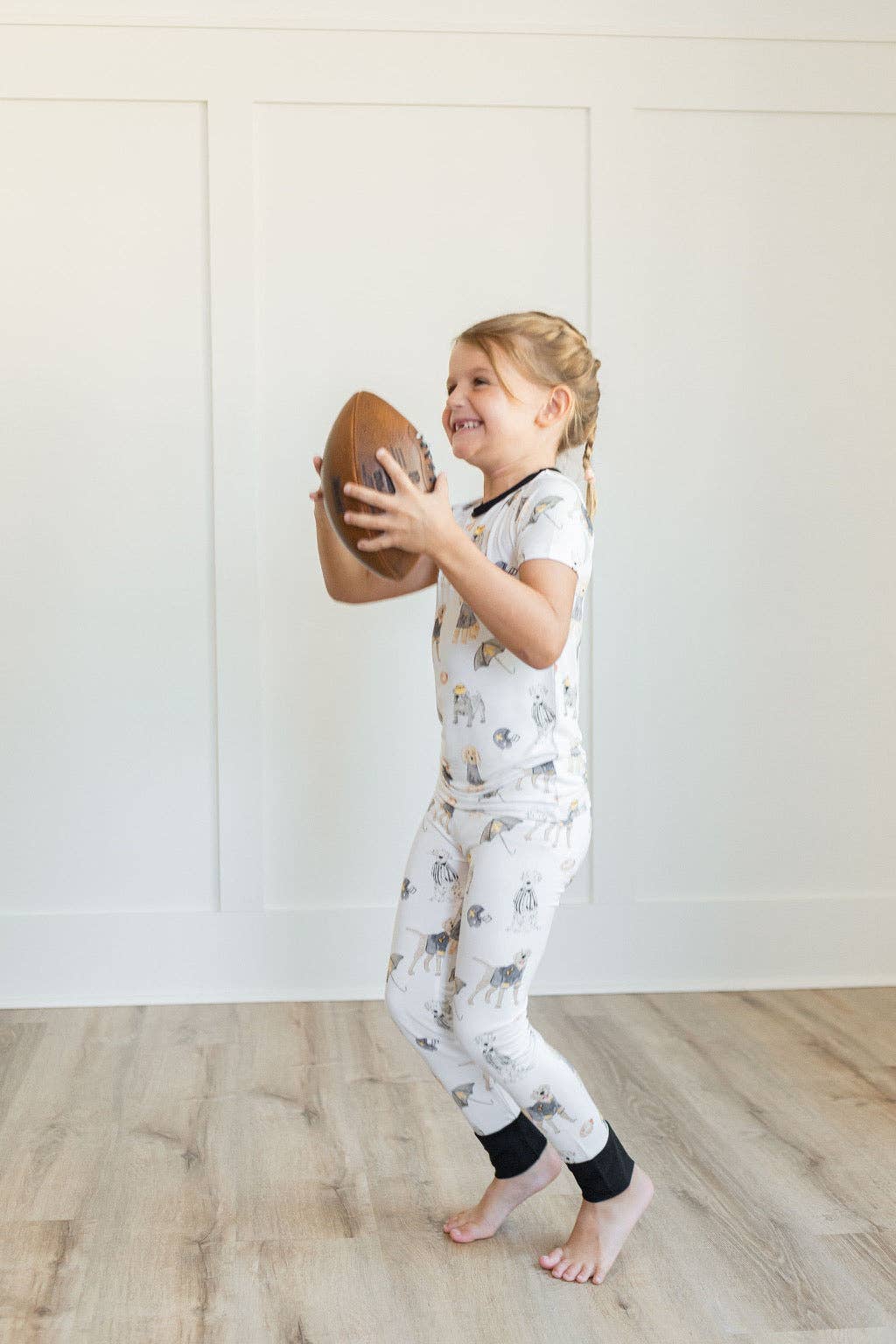 This set features a playful Puppy Football watercolor design in Black & Gold, made from a soft, stretchable fabric blend of 95% bamboo viscose and 5% spandex. For the safety of your child, it is important for sleepwear to fit snugly.