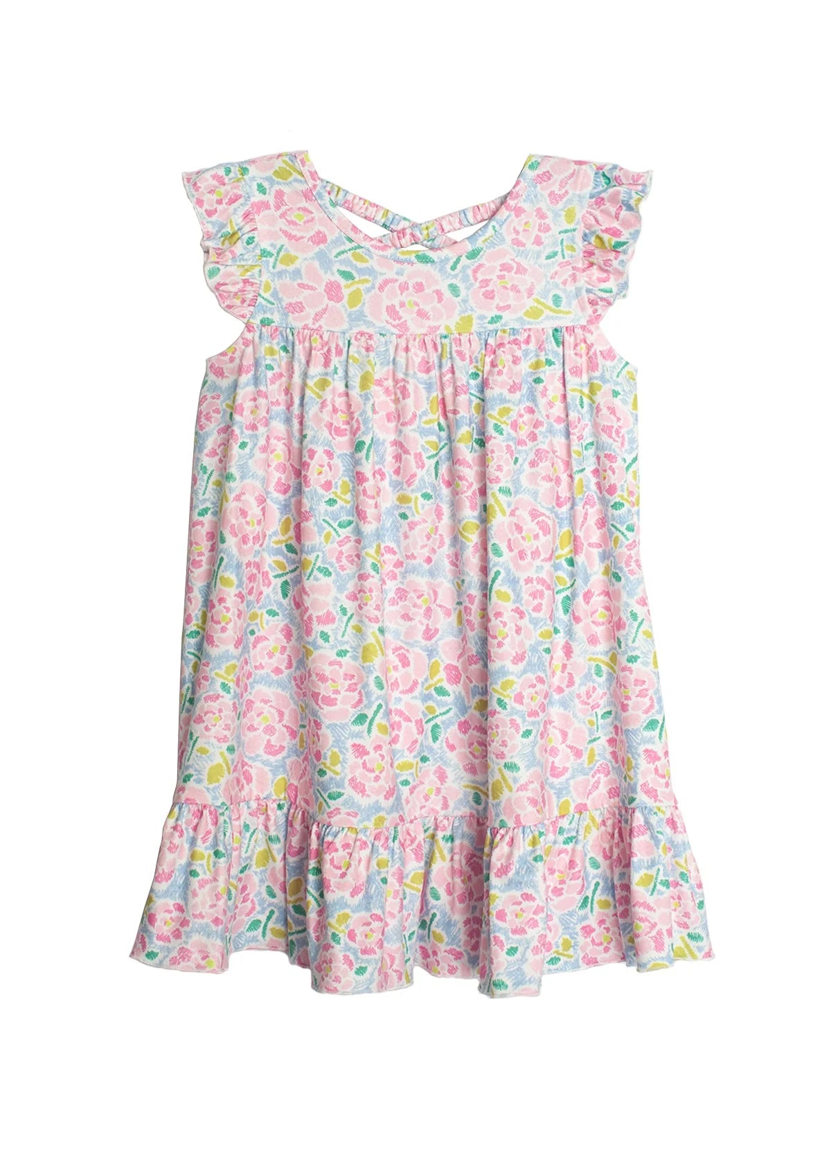 Crafted from breathable cotton, the Pink Scribble Empire Waist Dress is a charming garment with flutter sleeves and a vibrant pink and green floral print. This perfect summer frock features an empire waist and a ruffled hem for a final touch of flounce. Ideal for sunny days and picnics in the park, this dress is made from 100% polyester and can be easily cared for by machine washing in cold water and line drying. Remember, do not bleach.