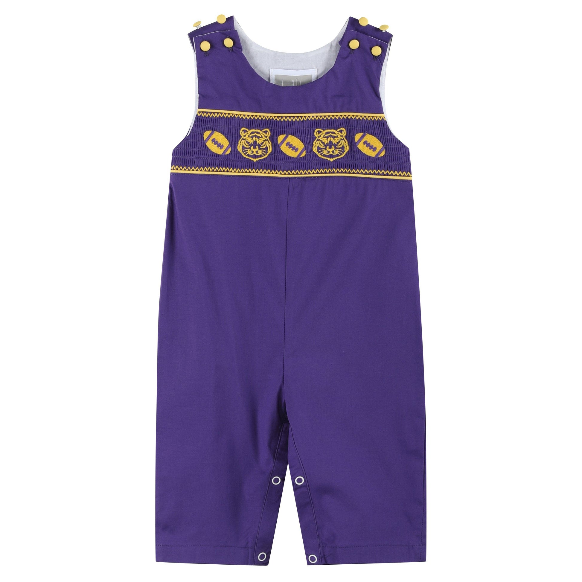 Get ready for a touchdown of cuteness with our Purple and Gold Football and Tiger Smocked Overalls! Featuring adorable smocking on the chest and playful embroidery of footballs and tigers, this outfit is a winning play for your little quarterback. Kick off the fun with style in these charming football-themed overalls, perfect for your tiny sports enthusiast